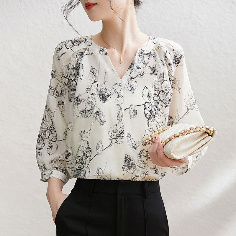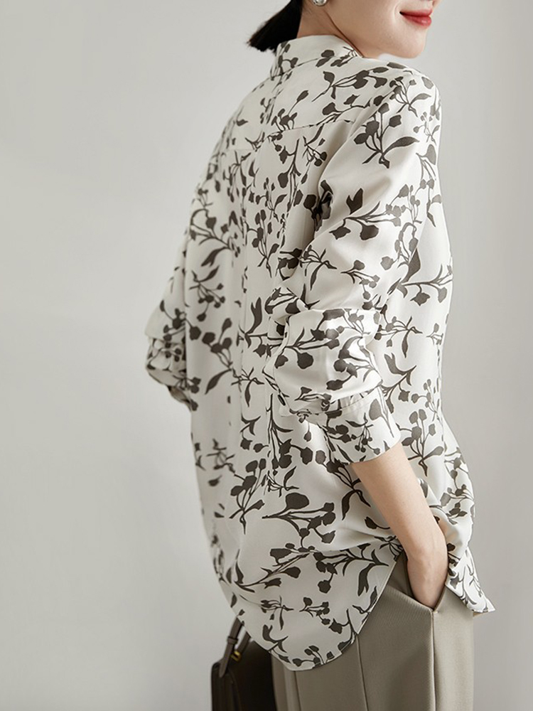 都市通勤復古印花真絲襯衫