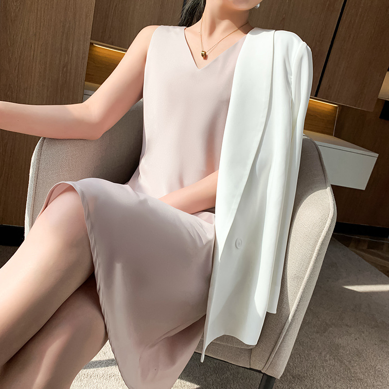 韓系簡約百搭通勤醋酸緞面V領洋裝(4色)