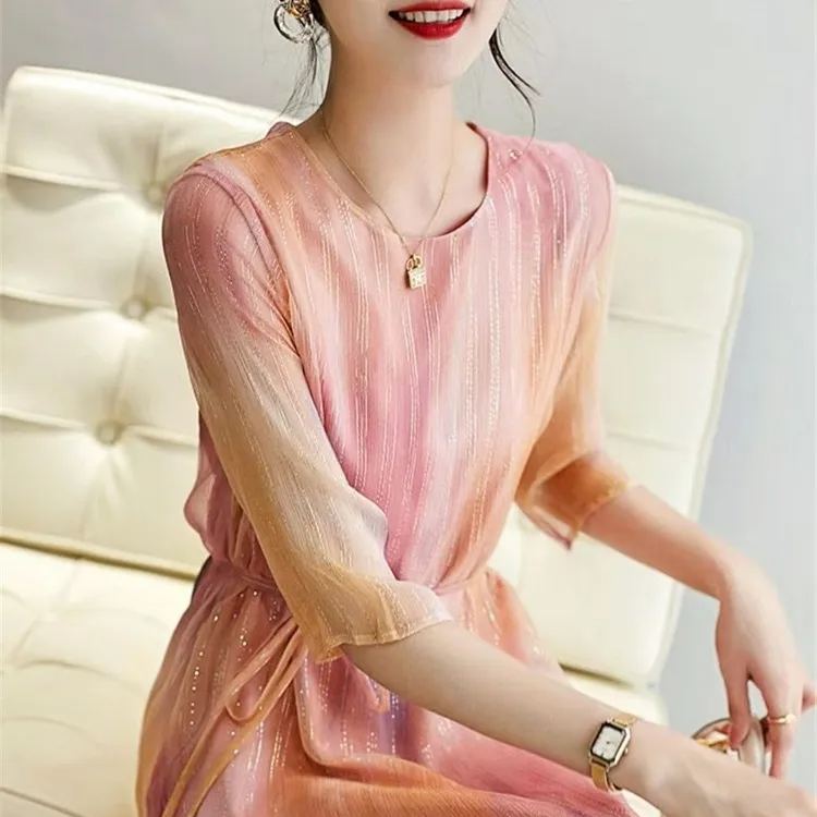 渐变晕染不规则下摆系带收腰連衣裙