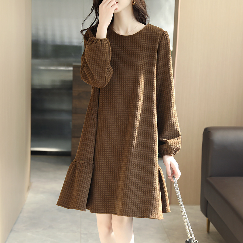 復古圓領純色長袖收腰連衣裙