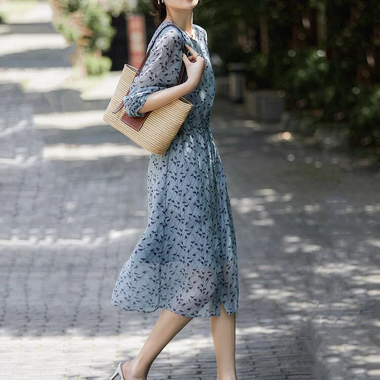 法式印花V領收腰中長洋裝