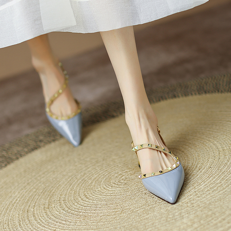 軟皮鉚釘淺口尖頭平底包頭涼鞋
