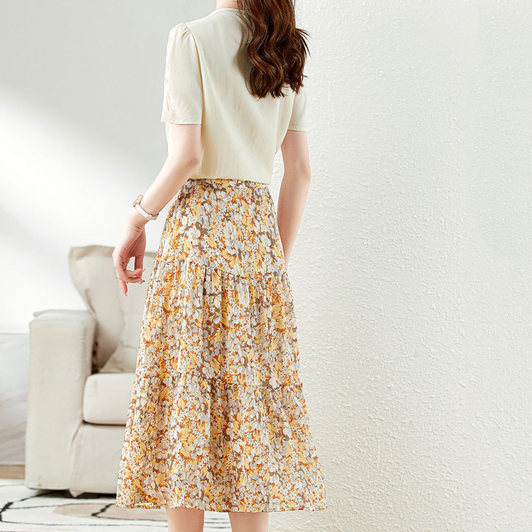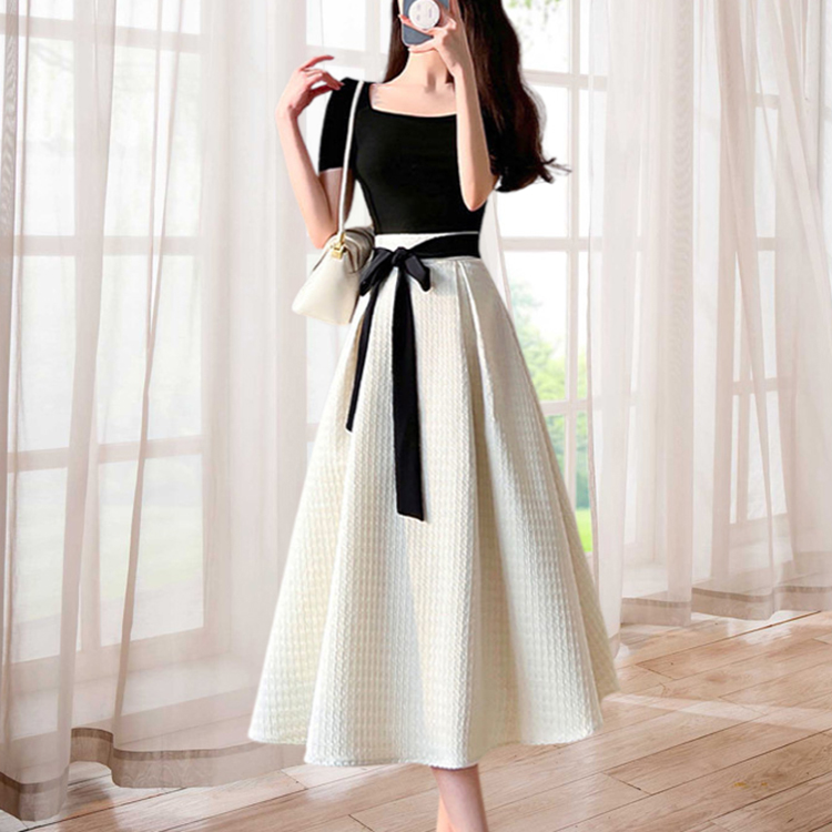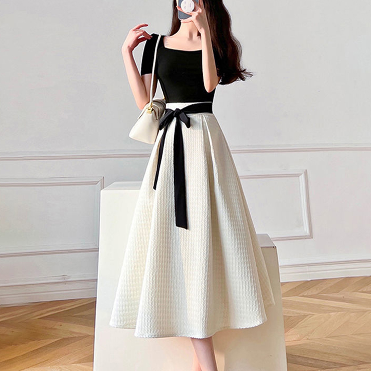 顯瘦方領短袖上衣+高腰A字半身裙兩件套裝