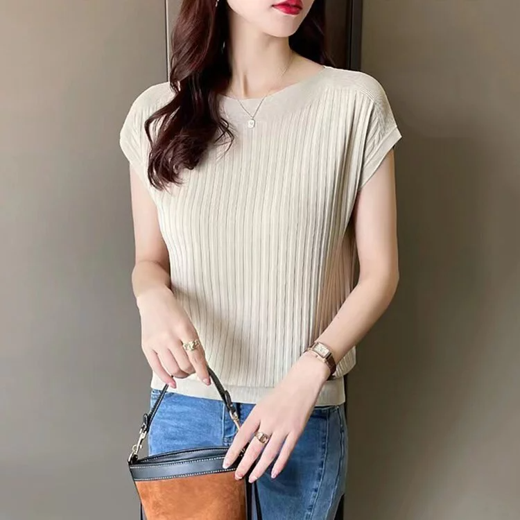 寬鬆一字領蝙蝠袖冰絲針織短袖T恤(7色)