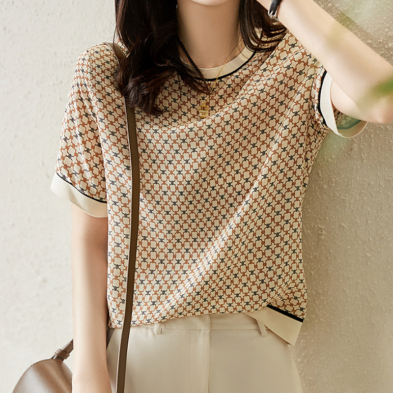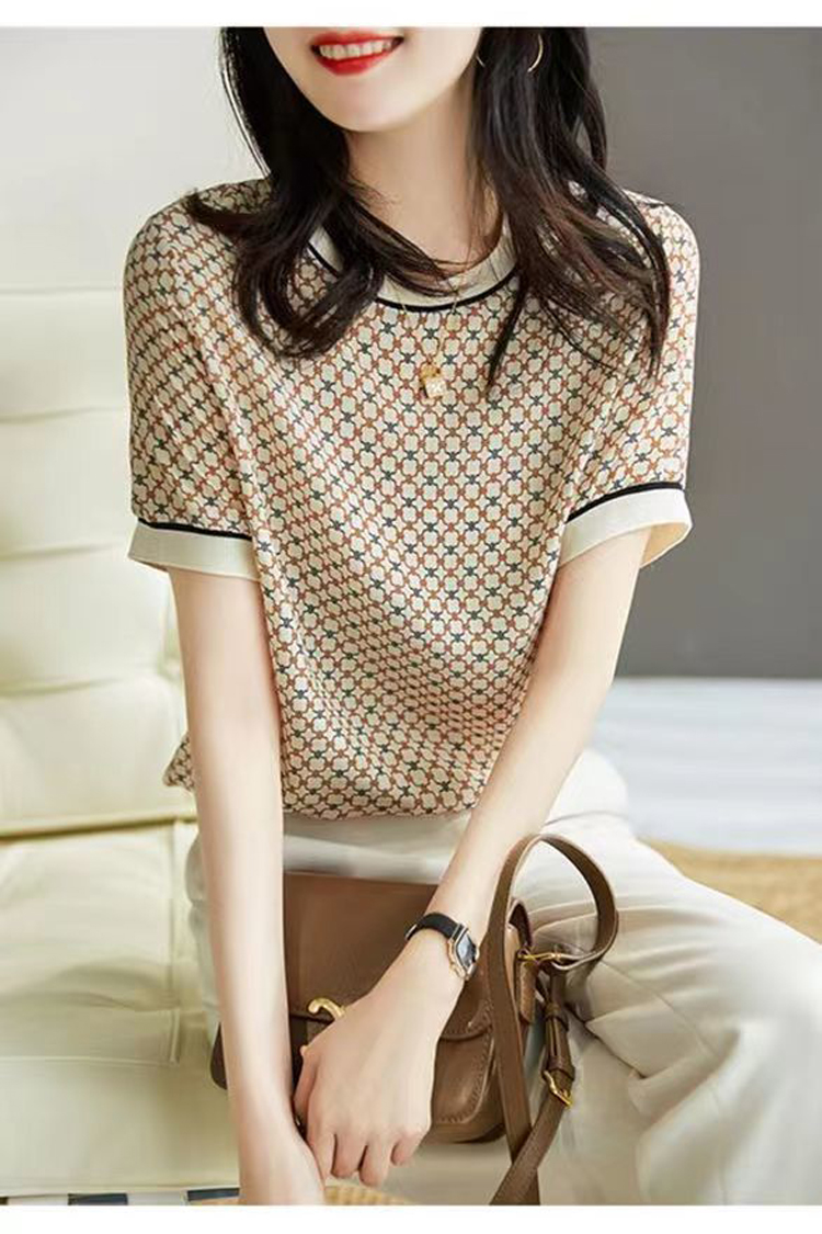 清新復古菱形格紋仿真絲T恤