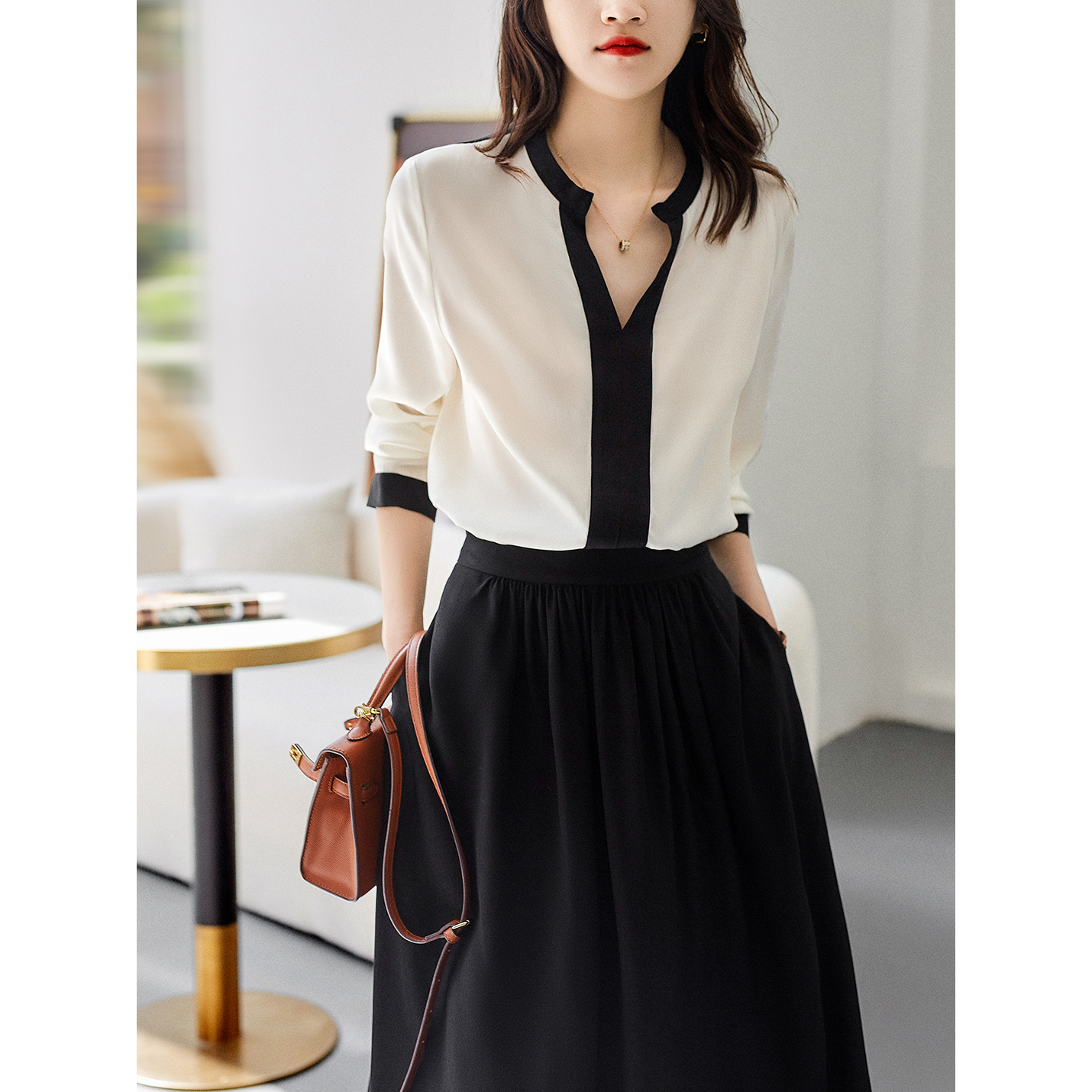 黑白拼接V領氣質雪紡衫