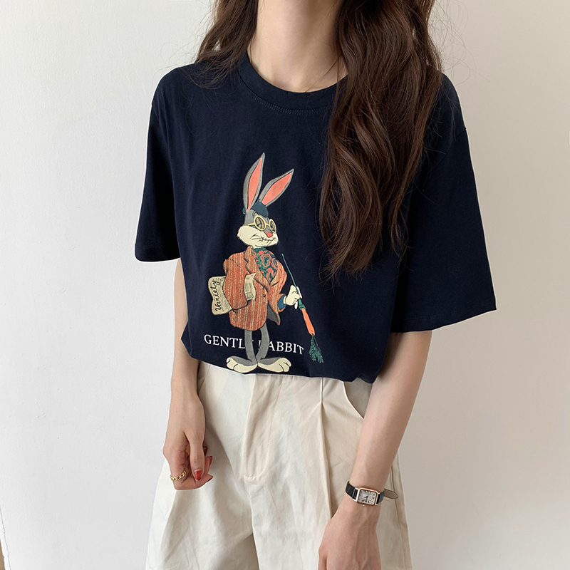 簡約休閒卡通兔子印花棉T恤(三色可選)